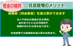 つまり、任意整理の場合交渉の相手を自分で選ぶことが出来るという事になります。自分で選ぶというと1人で判断すると勘違いするかもしれませんが、これは弁護士や司法書士の代理人が債務者(借金をした人)にベストな方法を提示してくれます。